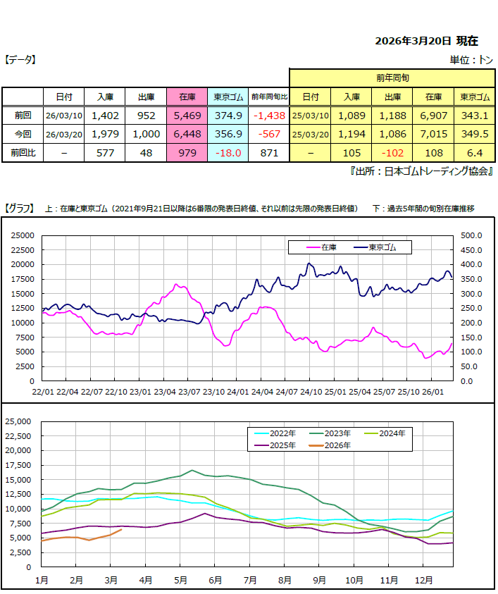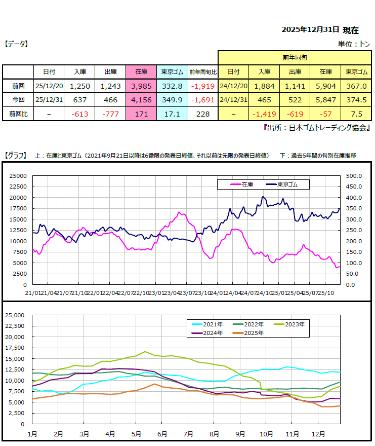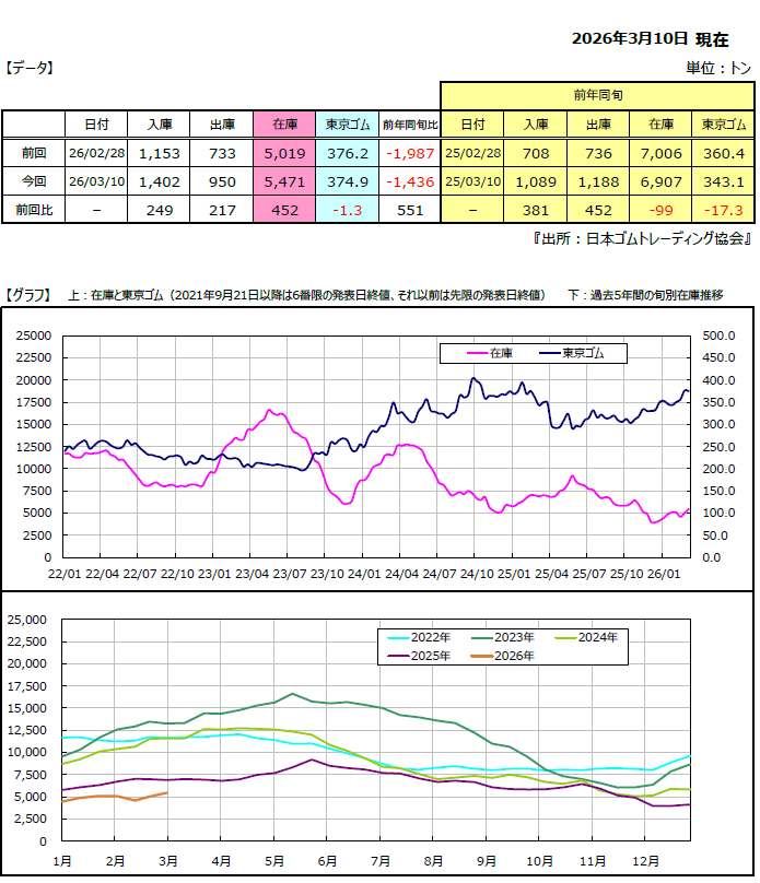岡地株式会社ではこの発表を整理してグラフ化したレポートを都度更新しており、在庫推移と価格を時系列で見ることができます。