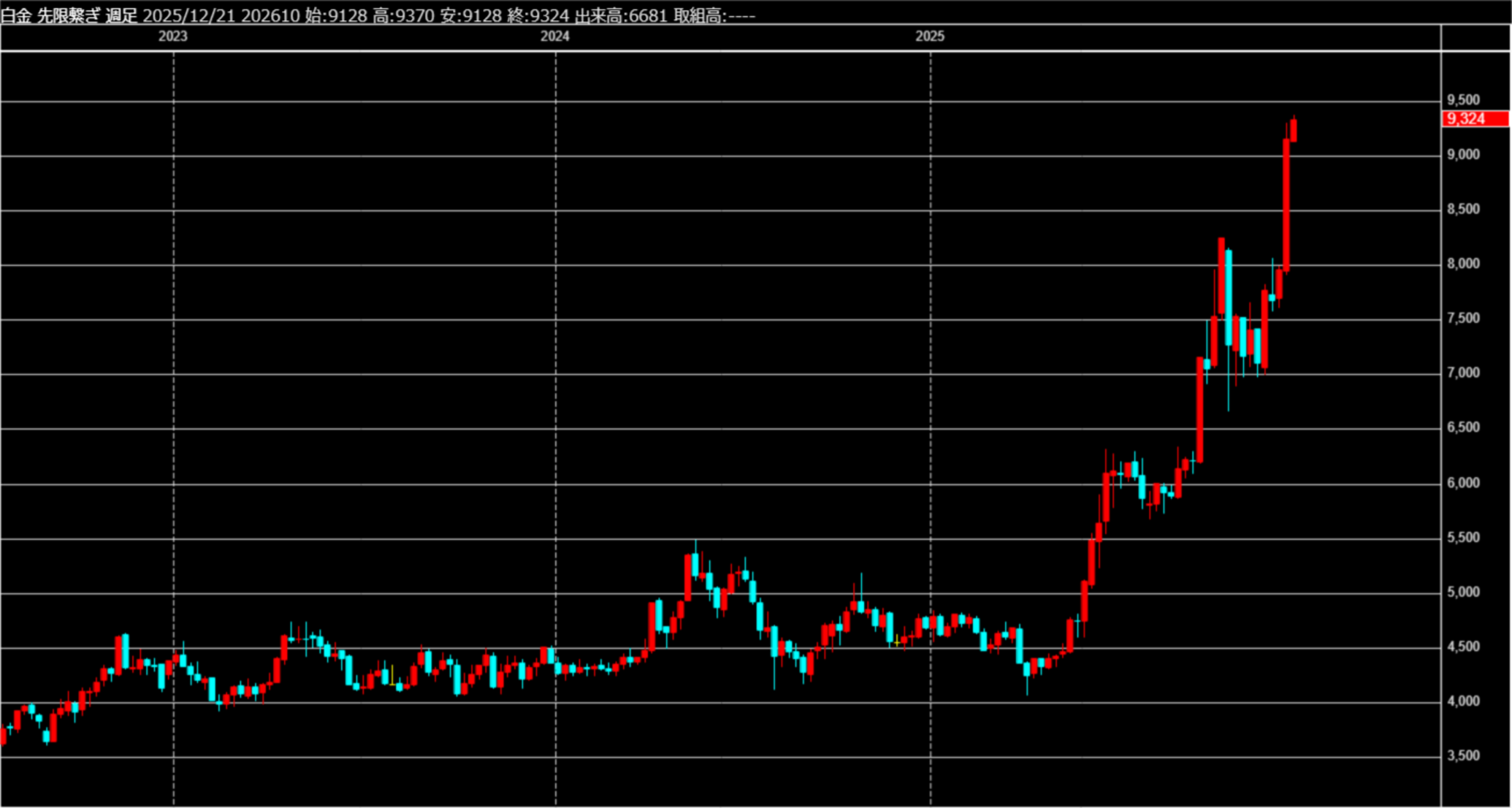 そのため金価格に比べ出遅れ感が強かったプラチナ価格は、NY市場で今年115%の値上がりを示し、白金標準先物でも4686円の大発会から9370円まで4684円の上昇を行い100%の値上がりを示すなど、2026年は更なる高値を試す可能性が高まったと思える。