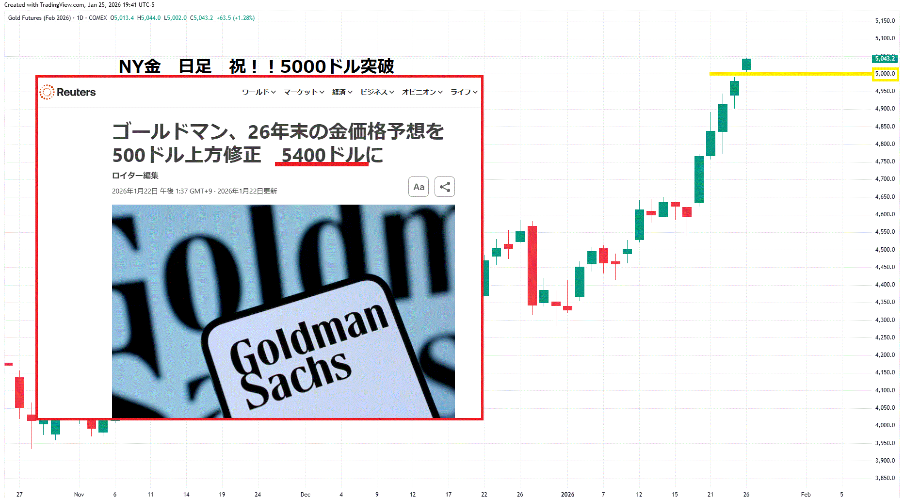 前回号では海外市場は4600ドル突破でしたが1/26早朝に5000ドル突破と勢いづいて来ております。