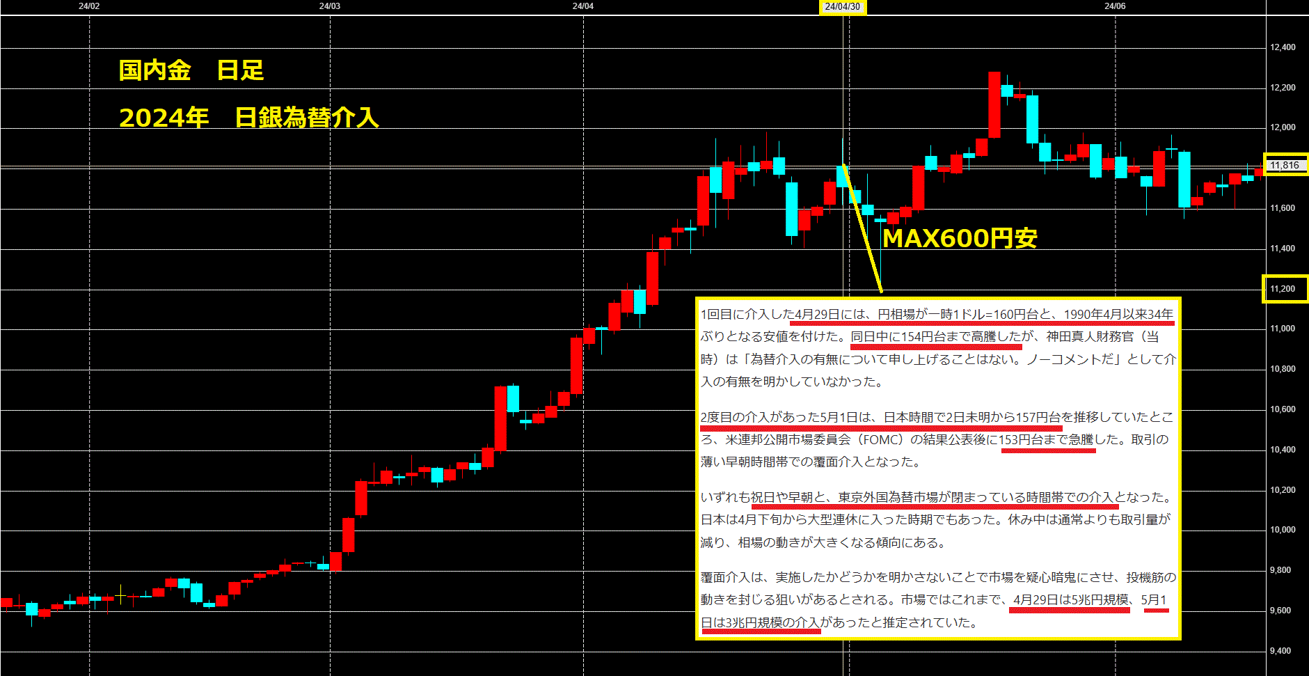 あくまでもチェックの段階ですので実弾が入ったかどうかは分かりません。前回2024年実弾介入時で前日の終値から最大で600円安がございました。