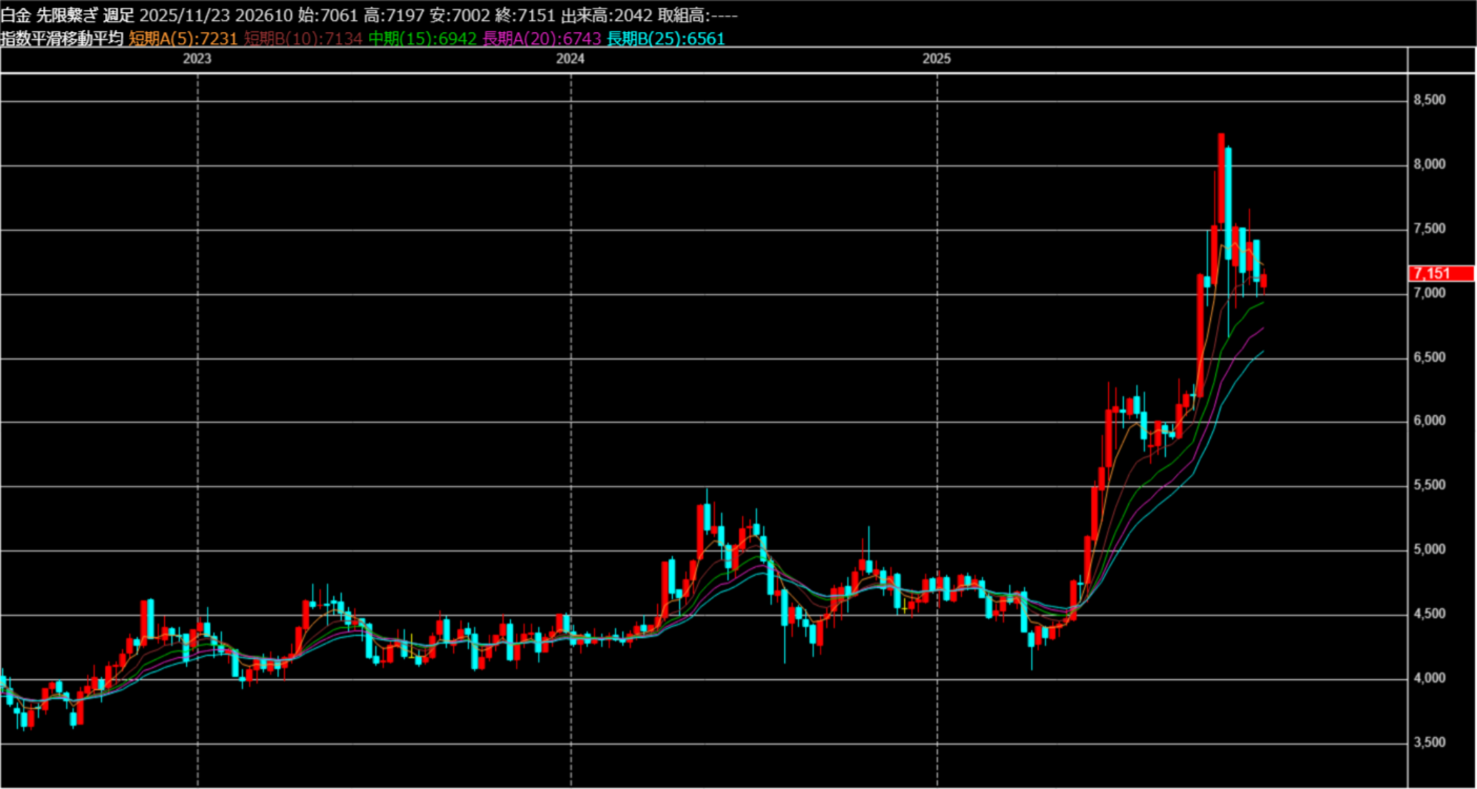 そのため現在の白金標準先物は、9月末から7000円以下で底堅い抵抗をし続けており、WPICの需給報告もあり、2026年に向け更なる高値を試す可能性は強まると思え、7000円以下ではロングポジションを構築するのが妥当に思える。