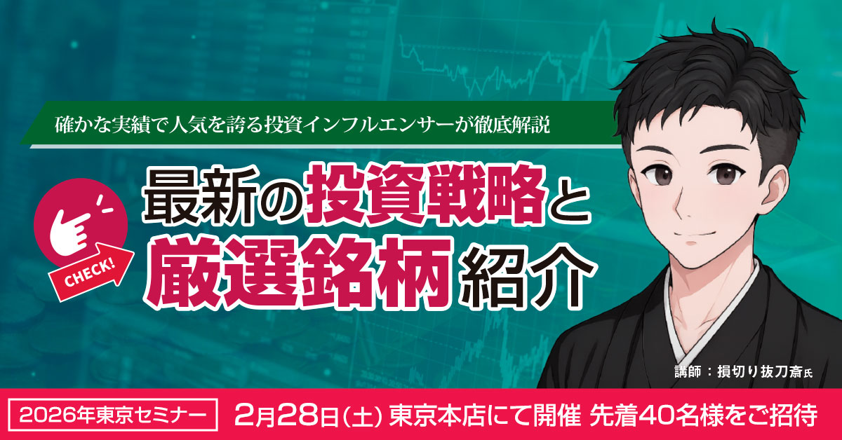 中長期投資を得意とし、徹底したリスク管理で高い堅実な投資手法を確立し、多くの個人投資家から支持されている「損切り抜刀斎氏」。今回のセミナーでは、2026年の投資戦略・厳選銘柄を徹底解説いただきます。この機会に是非会場までお越しください。